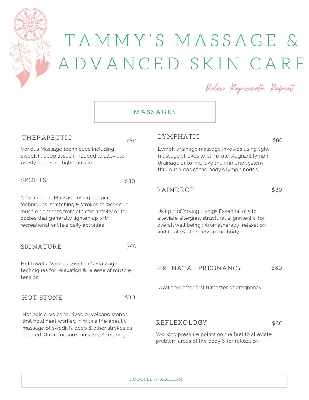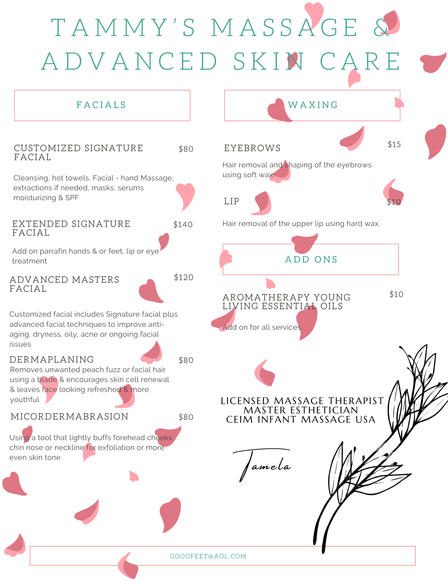 I offer a range of professional services from Massage Therapy and Esthetics services to Continuing Education. I promise to provide every service with a smile, and to your highest level of satisfaction. - Tammy